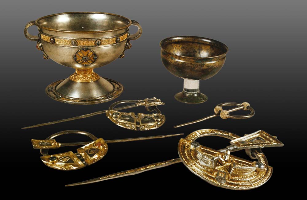 The hoard itself comprises six objects: the great silver chalice—explored in detail above—a smaller plain copper‑alloy cup, and four silver brooches, one large, elaborately decorated penannular brooch and three pseudo‑penannular brooches. The chalice is generally assigned to the 8th century based both upon its style and its inscription. The latest piece in the group, a thistle brooch, belongs to the late 9th or early 10th century.