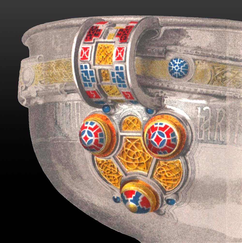 This chromolithography detail of the Ardagh Chalice was adapted from the Earl of Dunraven's 1873 journal article.