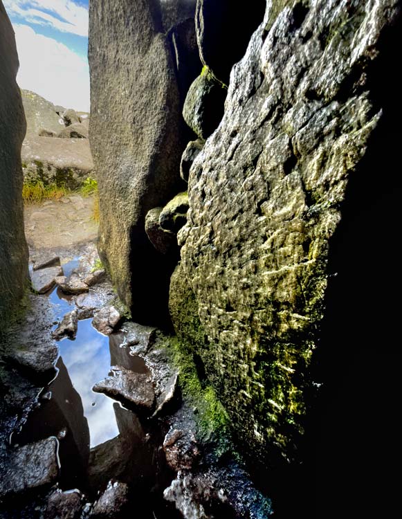Today, visitors can enter through the hole in the top, or squeeze through the narrow passage that Mcalister used (see photograph below). Emerging into the heart of the tomb, you find yourself encircled by slabs of Wicklow granite, their corbelled roofing partly fallen, the sky visible through the ragged opening overhead. In our VR tour (top) the monument is entered through this roof-top opening. We should mention, however, that posted signs warn that the stones are unstable and ask visitors not to enter the tomb.