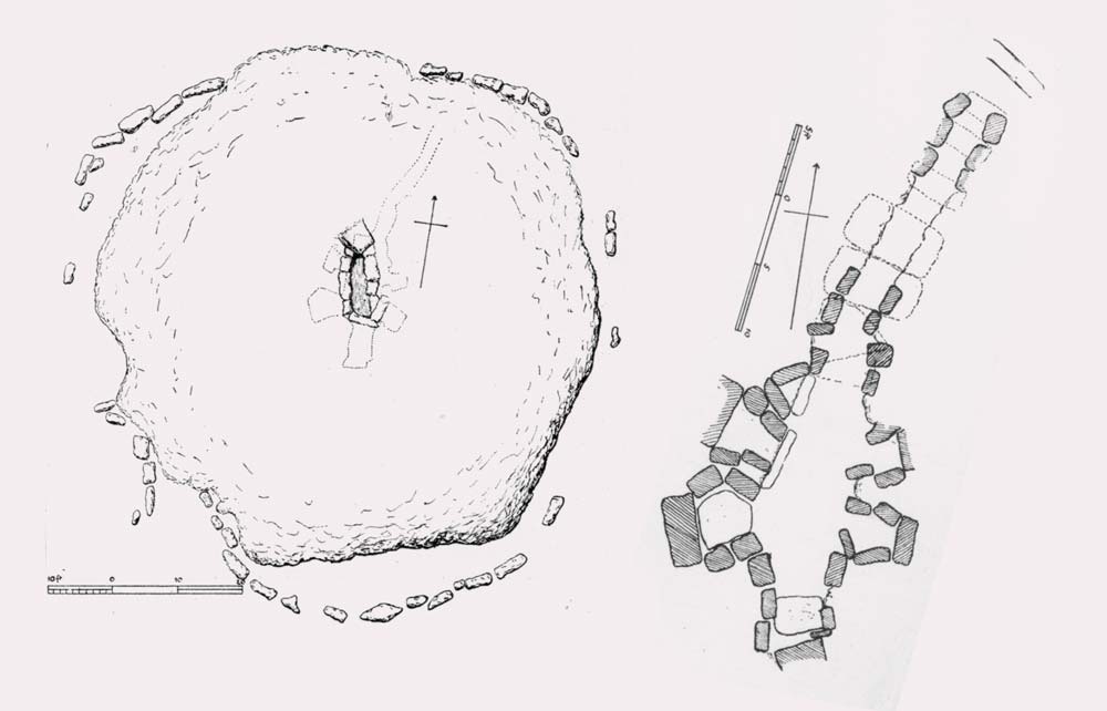 Macalister’s plans show the monument in precise detail. The cairn is encircled by a discontinuous kerb of stones up to 5 feet long, many shifted but still clearly marking the cairn’s original profile. The passage, about 7 meters (23 ft.) long and in places scarcely 2 feet wide, runs slightly askew to the axis of the inner chamber (see diagram above).