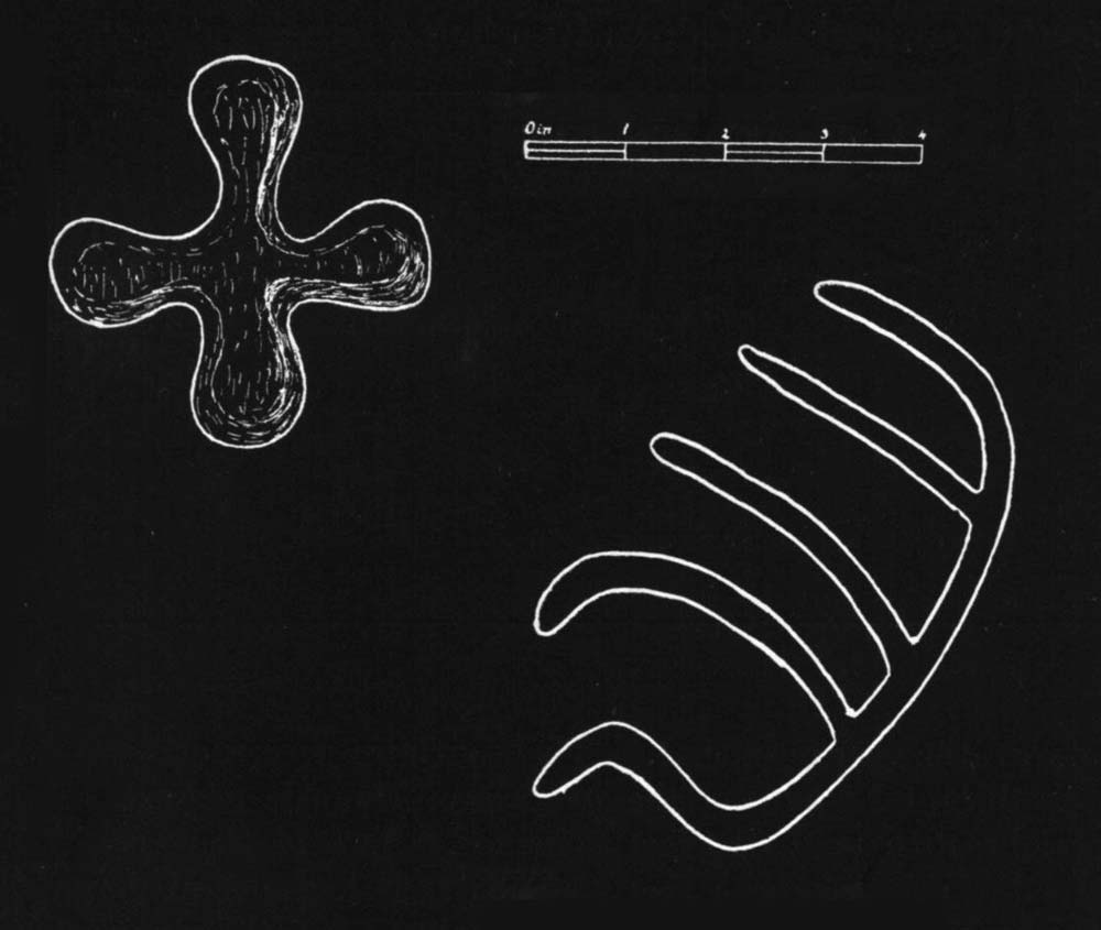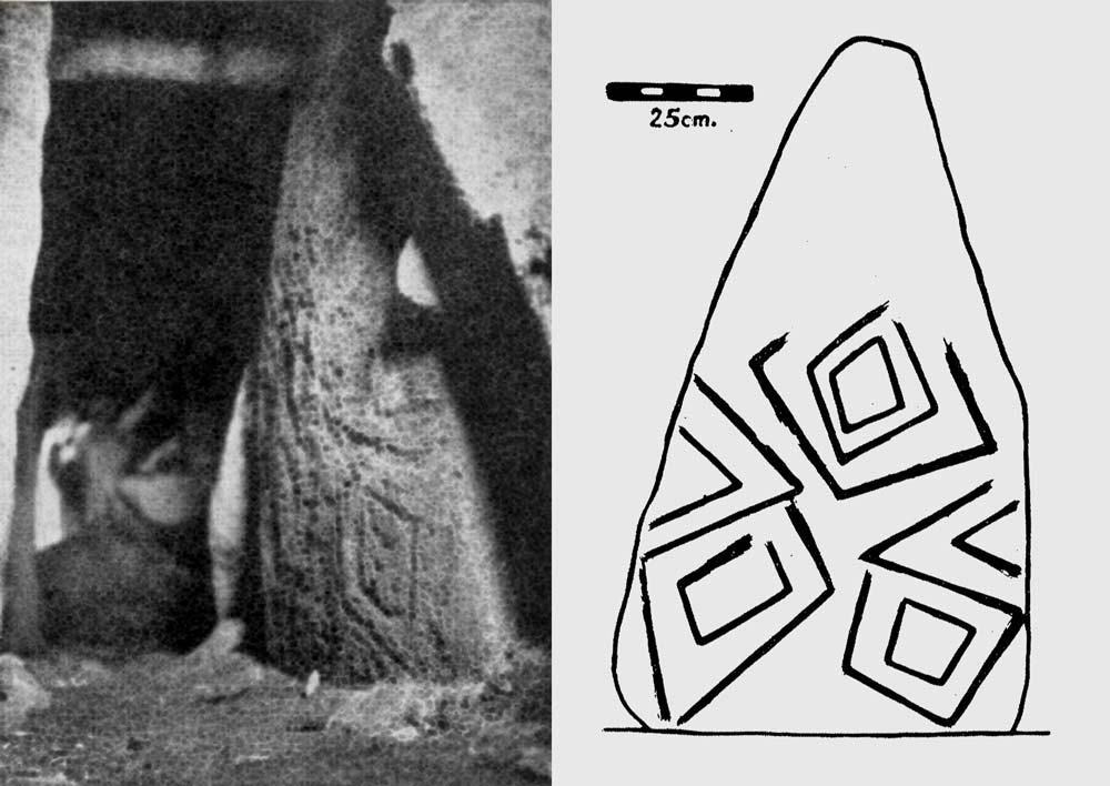 The first, “Stone 4,” is about 1.3 meters (4 ft.) high and decorated with a lattice of lozenges and oblique lines, chiseled into the granite by careful pocking. Macalister’s photograph of this stone, along with Etienne Rynne’s 1963 rendering may be seen here. Its neighboring stone bears a single prominent lozenge with paired lines projecting downwards, like a stylized pendant or abstract emblem.
