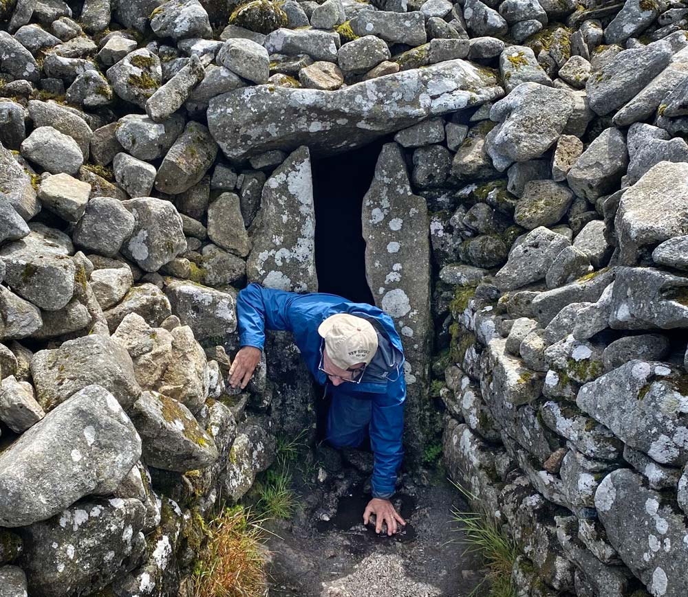 The pregnant mound of stones, with its narrow, birth‑like passage, has even been read as a cosmic womb, a symbolic route for souls between worlds. Note the photograph of this author squeezing himself out of this tight passage after making the photographs for the VR tour on this page.